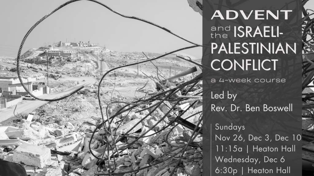 Join our Senior Minister, Rev. Dr. Ben Boswell during the season of Advent for a conversation on the religious political history of the Israeli-Palestinian conflict and our response as people of faith and good conscience. We will meet in Heaton Hall immediately following worship for three consecutive Sunday (November 26, December 3, and December 10) at 11:15 am and at 6:30 pm on Mosaic Wednesday on December 6, to share our grief over the violence, war, and loss of life.