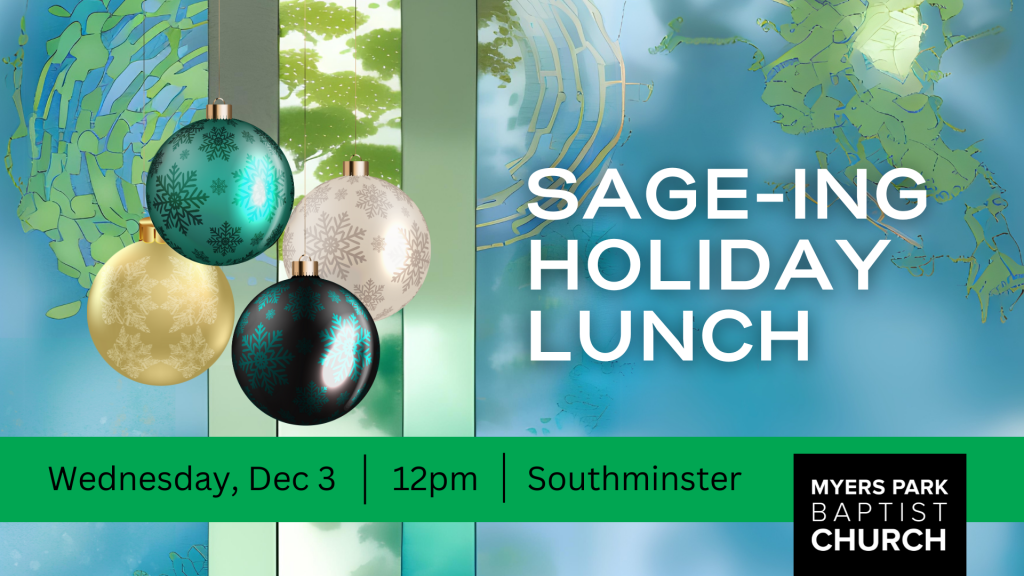 Southminster Retirement Community is delighted to gift all Myers Park Baptist Church Seniors with a delicious holiday lunch at Southminster Retirement Community on Wednesday, December 3 at noon.