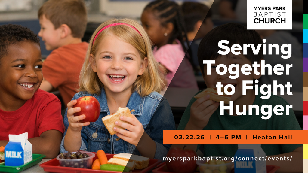 On Sunday, February 22, 2026, from 4:00–6:00 pm, Myers Park Baptist Church invites everyone—children, youth, adults, and seniors—to gather in Heaton Hall for an intergenerational, churchwide service event focused on addressing hunger in our community. We'll fuel the fun with pizza and dessert for all volunteers.