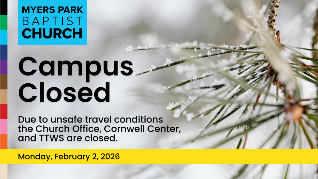 Due to unsafe travel conditions, the entire church campus will be closed on Monday, February 2. This closure includes the Church Offices, the Cornwell Center, and TTWS.
