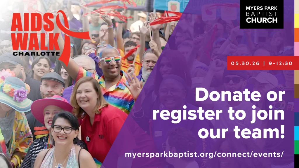 The AIDS Walk is Saturday, May 30. Our goal is to raise $7,500. If you would like to donate and/or join the Myers Park Baptist team, sign up by clicking the button below.