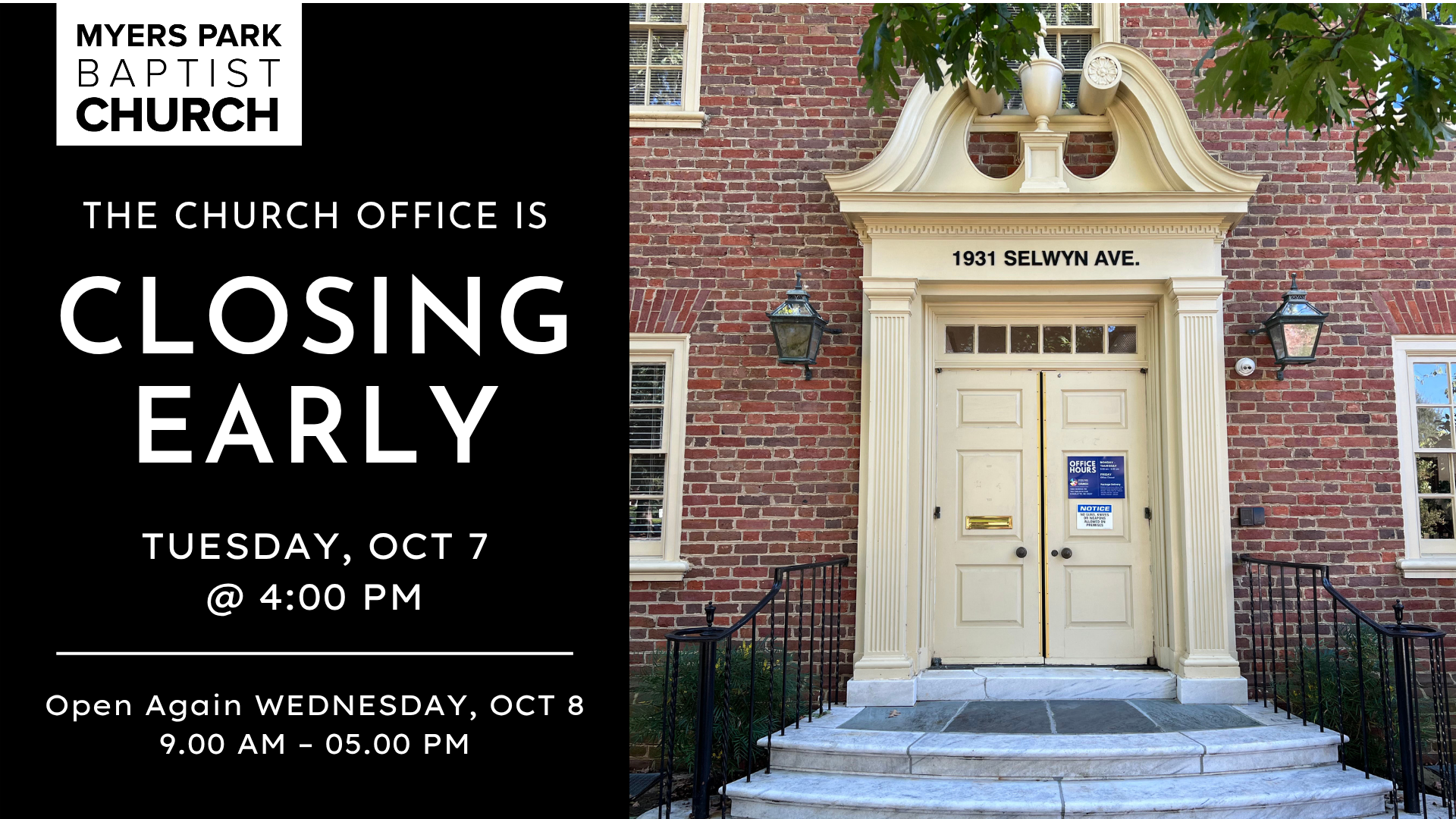 We’re grateful for Queens University’s ongoing support of our parking needs, and we’re glad to return the favor. To support our neighbor during their upcoming events, MPBC will close the church office early at 4:00 pm on Tuesday, October 7 to make additional parking available for their guests.
