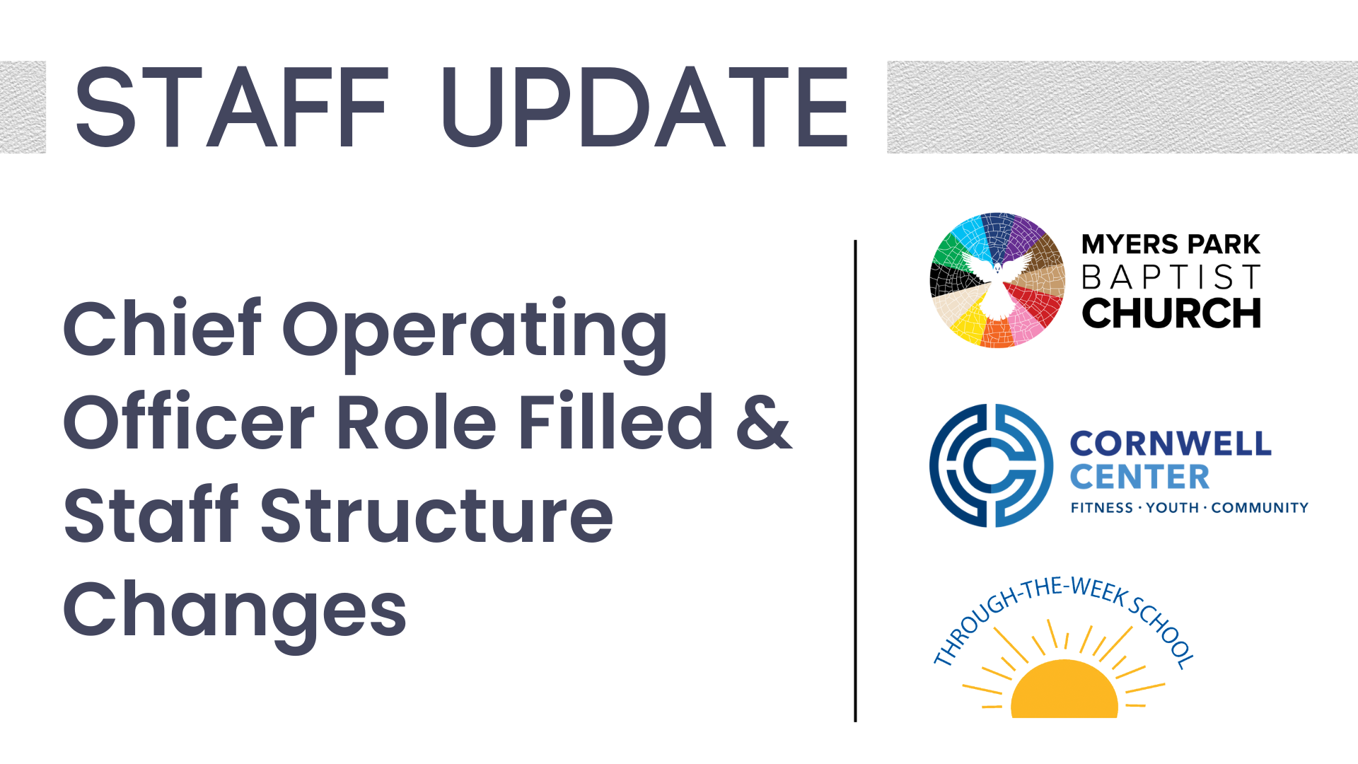 Tripp Caldwell has been promoted to our Chief Operating Officer. He will continue to oversee the Cornwell Center and will take on the additional responsibilities of finances and business operations for The Church and Through the Week School.