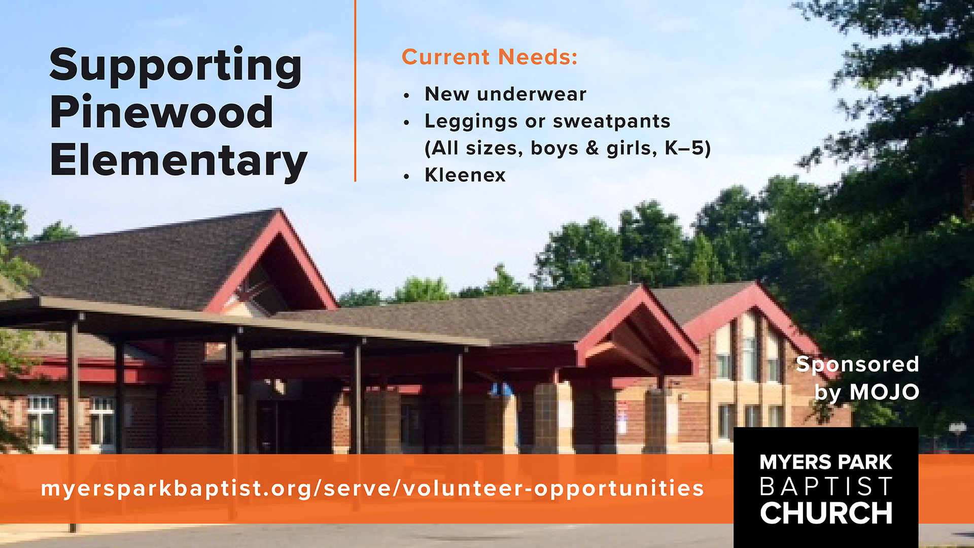 All donations may be placed in the clearly marked container in the entryway of Heaton Hall. Thank you for your continued generosity and for helping MPBC extend care and compassion to our neighbors at Pinewood Elementary.