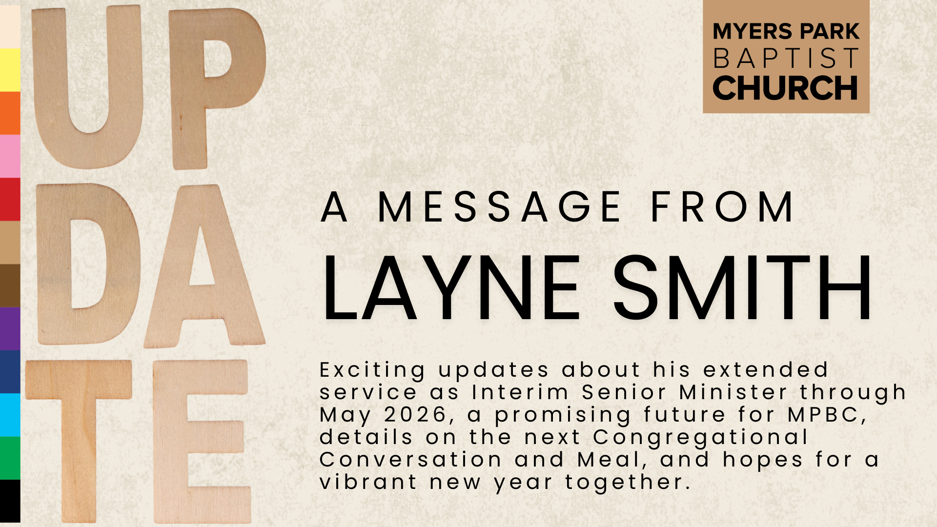 Thank you for the opportunity to share life and ministry with you! As you may know, my initial agreement with MPBC was for one year, beginning March 4, 2025. That year is almost gone. The HR Deacons and I have agreed for me to remain as your Interim Senior Minister through the end of May 2026. I look forward to what the next five and ½ months have in store for us.