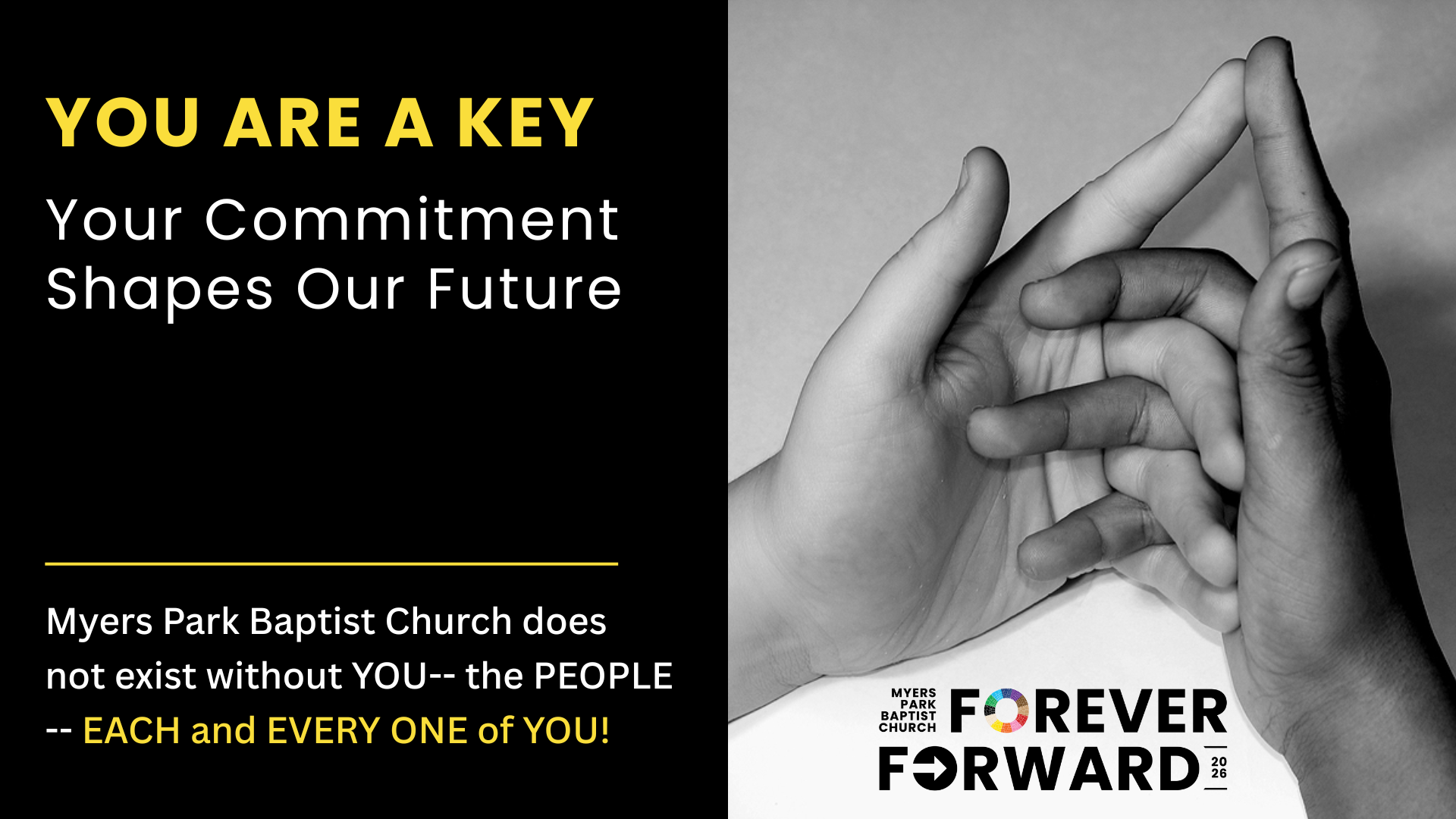 Your presence and participation are vital to the life of Myers Park Baptist Church. You are not just part of the church—you help define it. May you feel empowered to share your gifts, knowing that what you bring strengthens our community and honors the Spirit within you. You are a key.