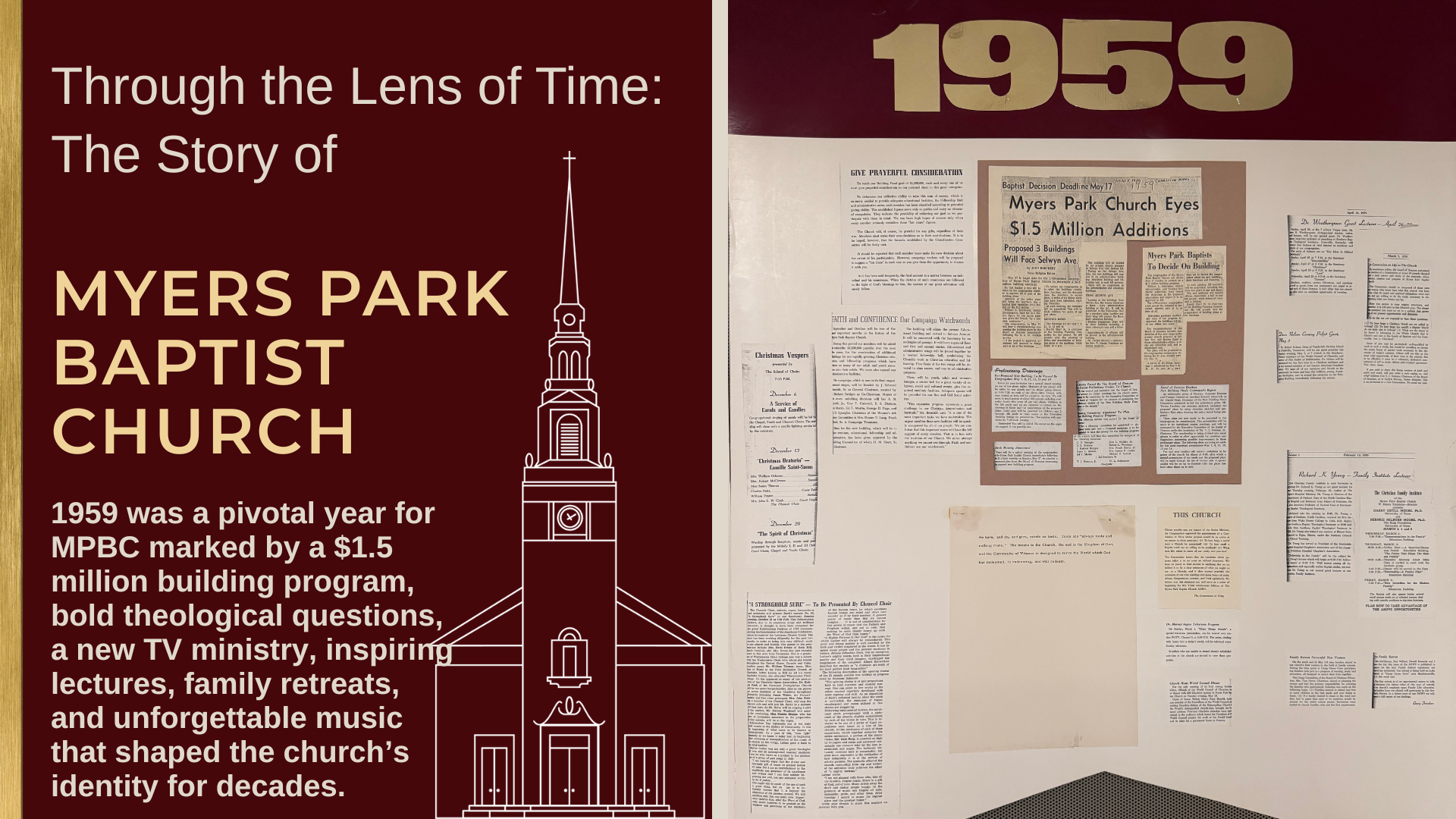 Under the visionary leadership of Dr. Carlyle Marney, 1959 marked a turning point for Myers Park Baptist Church, a year when bold plans and deeper questions converged. It was a season of expansion, as the congregation embraced a $1.5 million building program that would transform the campus, and a season of introspection, as the Commission of Forty wrestled with what it truly means to be a Baptist church in a changing world. From architectural dreams to theological inquiry, from televised ministry to vibrant worship and music, Myers Park Baptist stood at the threshold of becoming, not just a larger church, but a more thoughtful, engaged, and faithful community.