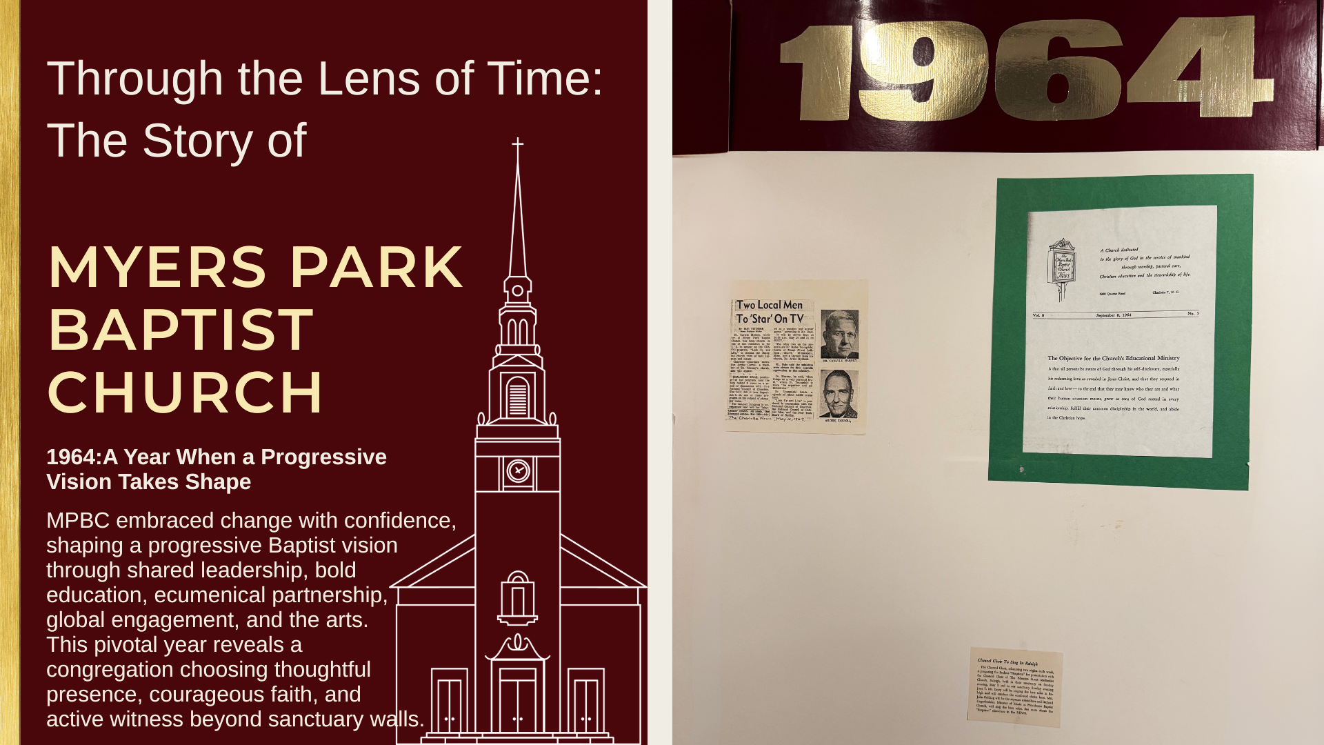 Together, these moments tell a larger story of a congregation seeking to live faithfully at the intersection of tradition and change. In 1964, Myers Park Baptist Church embodied a progressive Baptist witness marked by shared leadership, ecumenical openness, global awareness, lifelong learning, and artistic expression. Through these commitments, the church bore witness to a faith that was not confined to sanctuary walls but actively engaged the world as an expression of following Christ with courage, imagination, and hope.