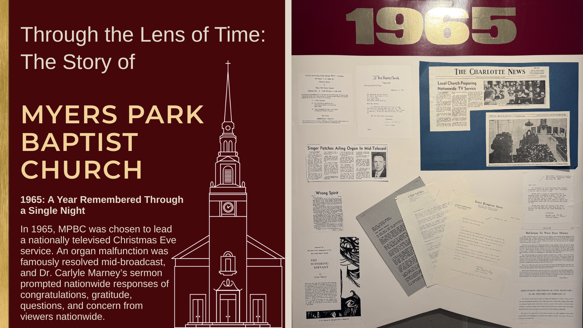 In 1965, Myers Park Baptist Church was entrusted with a rare and significant responsibility: to lead a nationally televised Christmas Eve worship service. The selection itself mattered. At a time when very few congregations were invited into the nation’s living rooms for worship, Myers Park Baptist Church was chosen to represent both the sacred meaning of the evening and the life of the church beyond its own community.