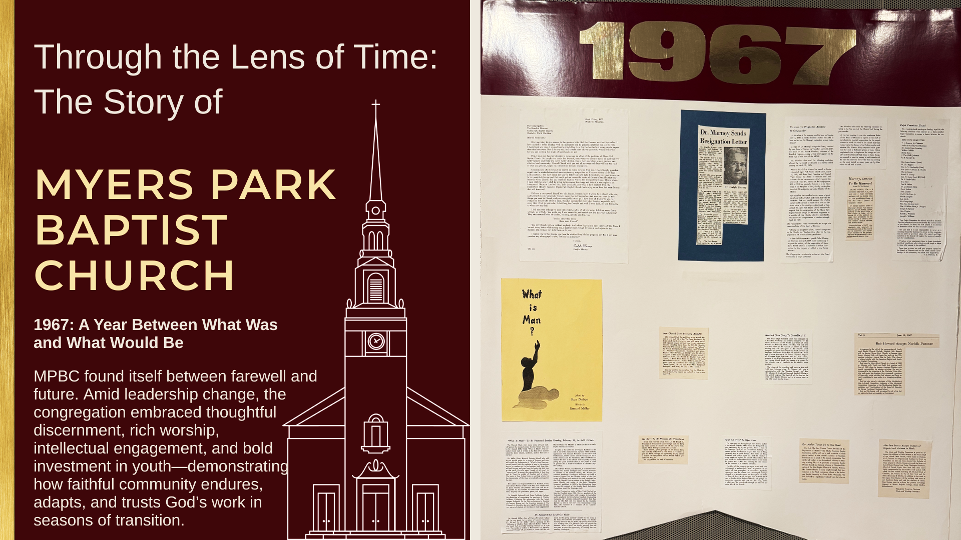 Looking back, 1967 stands as a year of profound transition and faithful continuity at Myers Park Baptist Church. Amid the loss of a beloved minister, the congregation demonstrated resilience, thoughtful leadership, and an unwavering commitment to worship, education, music, and youth. Even in moments of uncertainty, the church listened deeply, honored its past, and invested boldly in its future—trusting that God’s work continued, not despite change, but often through it.