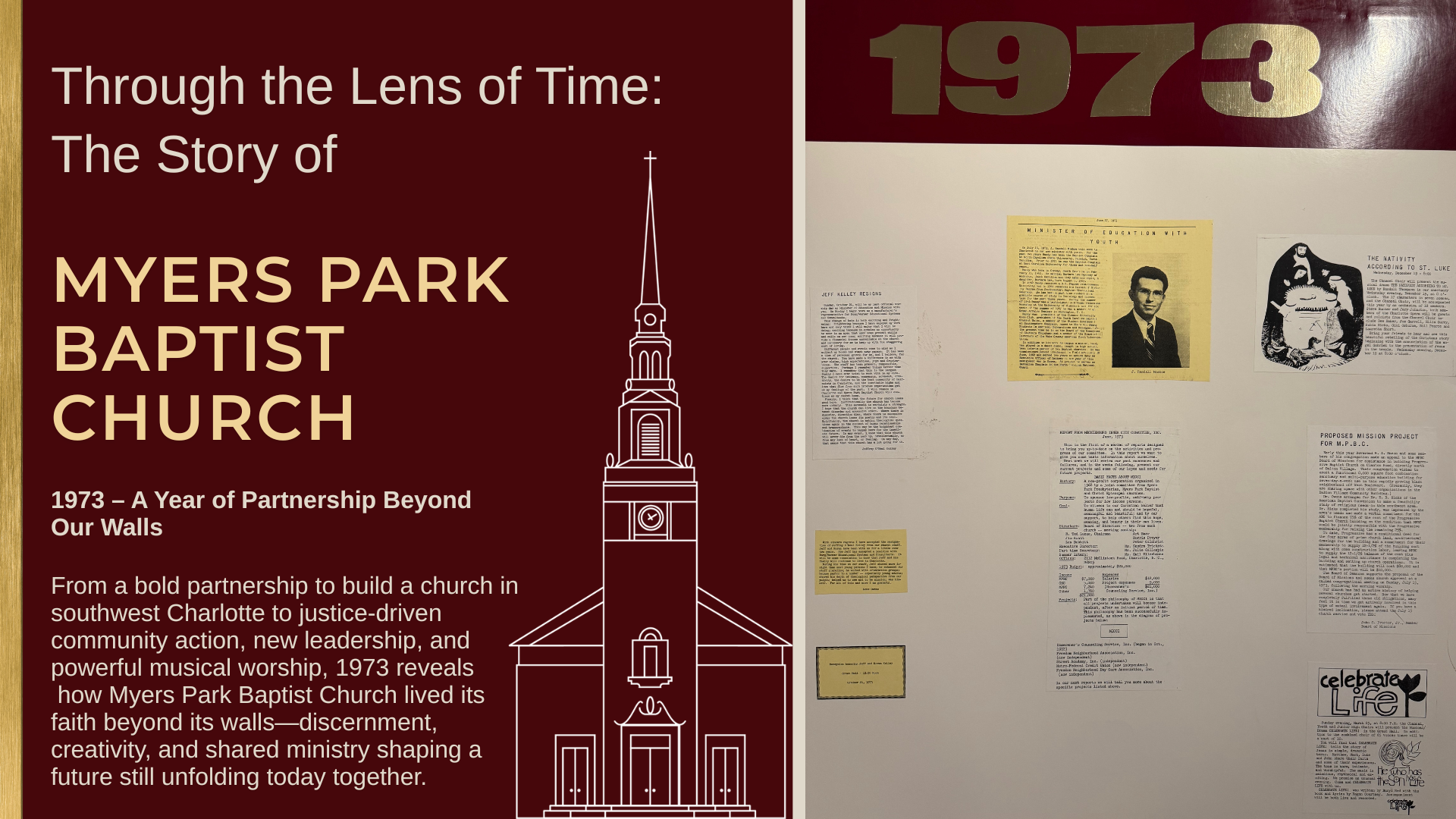 In 1973, Myers Park Baptist Church stood at the intersection of faith and action—considering a bold partnership to help build a church in southwest Charlotte, continuing hands-on justice work through Mecklenburg Inner City Community, Inc., welcoming new leadership, and giving voice to scripture through powerful musical drama. From boardroom conversations about shared ministry on Clanton Road to choirs filling the Great Hall and Sanctuary with song, this was a year when belief took shape in tangible, communal ways—revealing a congregation actively discerning how to live the gospel in its time and place.