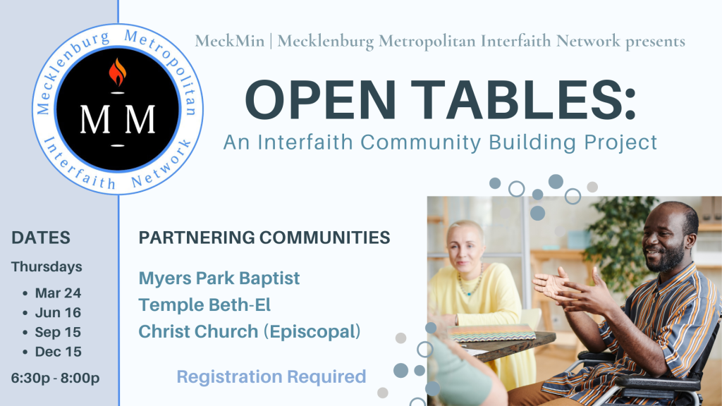 Open Tables is a project of the Mecklenburg Metropolitan Interfaith Network (MeckMIN) with the aim of building substantive relationships among diverse congregations through fellowship and food. Over tables (and recently over Zoom), people come together across lines of difference to share ideas and experiences about topics that matter through guided discussions.